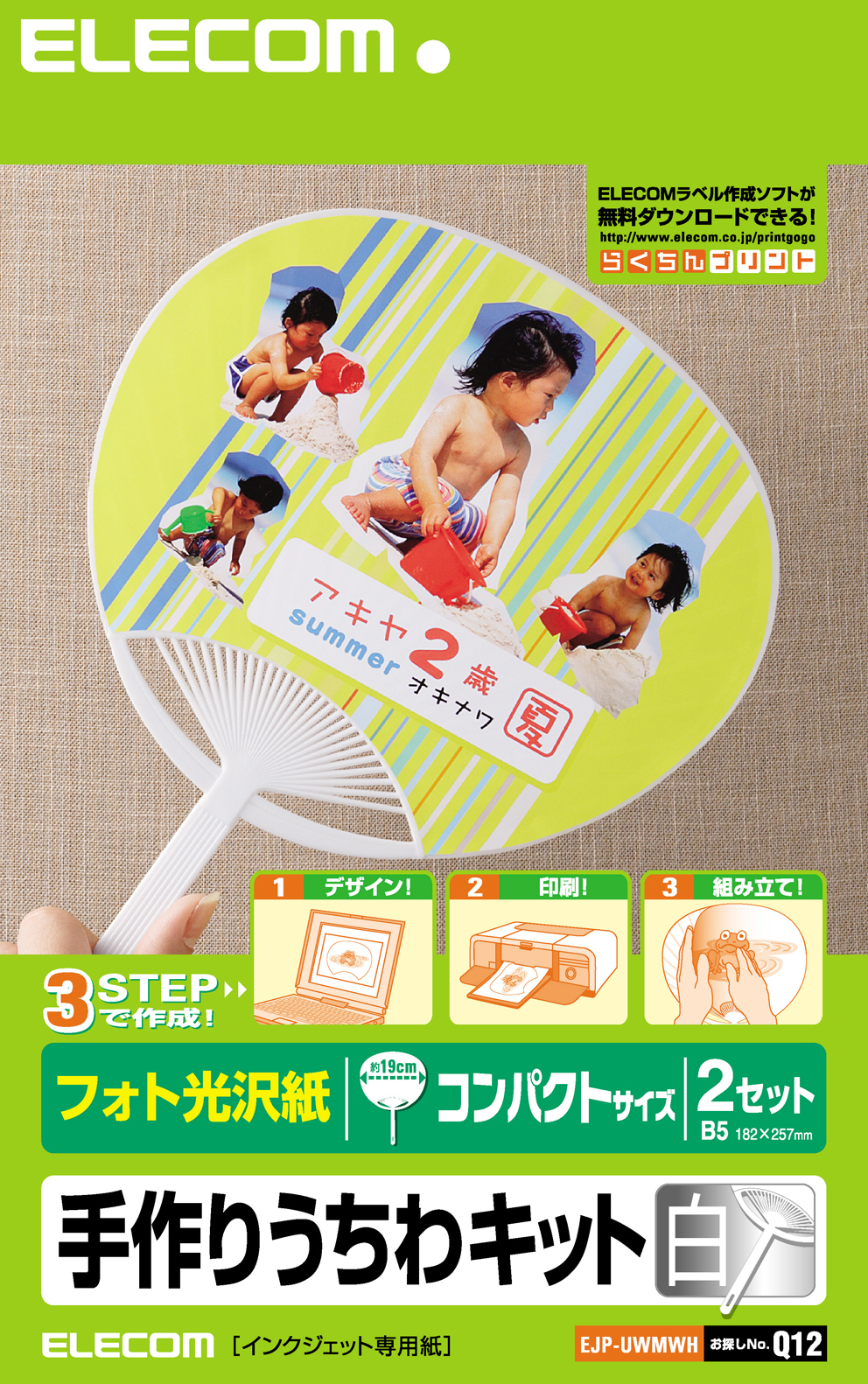 “EJP-UWシリーズ”および“EJP-SEN”は、ご家庭のインクジェットプリンタを使って、簡単にオリジナルデザインの「手作りうちわ」や「手作りせんす」を作成できるキットです。いずれも、お好みの写真やイラストなどを使ってデザインし、付属の光沢シールや薄和紙シールに印刷したあと、うちわの骨組みや扇子に貼り付けるだけで、世界にひとつしかないオリジナルのうちわや扇子が出来上がります。また、弊社のホームページからラベル作成ソフト「らくちんプリント」を無料ダウンロードしていただくと、どなたでも簡単にきれいな作品を作ることができます。
