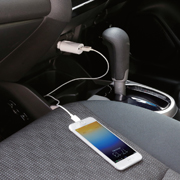 スマホなどの端末側のBluetooth®機能を利用することで、FMトランスミッターのように利用するたびに、端末の外部出力端子にケーブルや機器を接続する必要がなく、すぐさま音楽を再生することができます。また、FMトランスミッターに比べ電波が強く、安定した送受信が可能です。Bluetooth®によるワイヤレス接続で音楽再生が可能なため、後部座席でもスマートフォン/タブレットを操作できますので運転者の手をわずらわせることもありません。