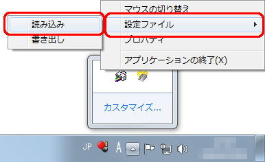- タスクトレイにある[ELECOMアイコン]を右クリックします。ユーティリティメニューの中から [設定ファイル]−[読み込み]を選択しクリックします。