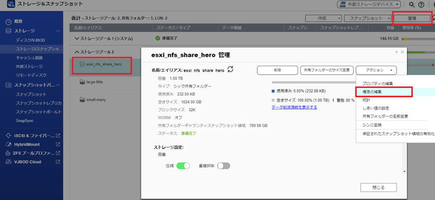プール配下に新規作成した共有フォルダが表示されますので選択します。次に右上にある “管理”ボタンをクリック > “権限”ボタン > 共有フォルダの権限設定画面が開きますので、権限タイプの選択から “NFSホストのアクセス”を選択します。