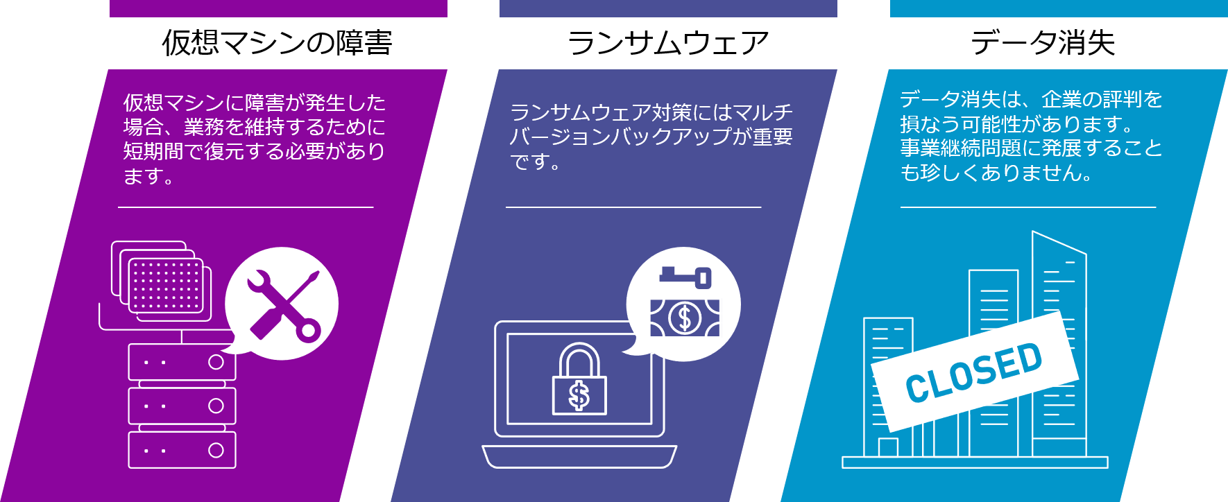 - 仮想マシンの障害・・・仮想マシンに障害が発生した場合、業務を維持するために短期間で復元する必要があります。