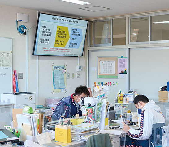 - 書類の提出期日など連絡事項を全生徒が目にするエントランスに大型ディスプレイを設置・配信し、生徒の利便性を向上