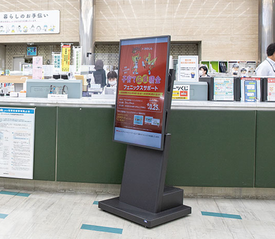 - 各窓口で可能な手続きの案内などをサイネージで配信し、来店者の利便性を向上