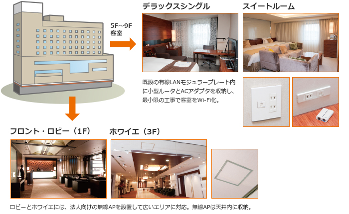 - ● 客室にすでに設置されていた有線LAN設備を有効活用するため「小型ルータ方式」を採用
