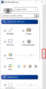 When WebCam+ is started by selecting ELECOM WebCam+ in a web conference app, etc., the settings will be reflected on the screen of the web conference app, etc. in real time.