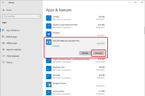 - Select “ELECOM WebCam Assistant Plus” on Apps & features, and then click [Uninstall].