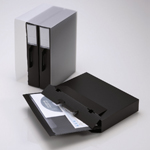 | 可動式の中仕切りで冊子と付属品を分けて収納可能(写真左)。各ボックスは取手付きで引き出しが容易。また、3個のボックスを1つにまとめて収納できる外箱付き(写真右)。 |