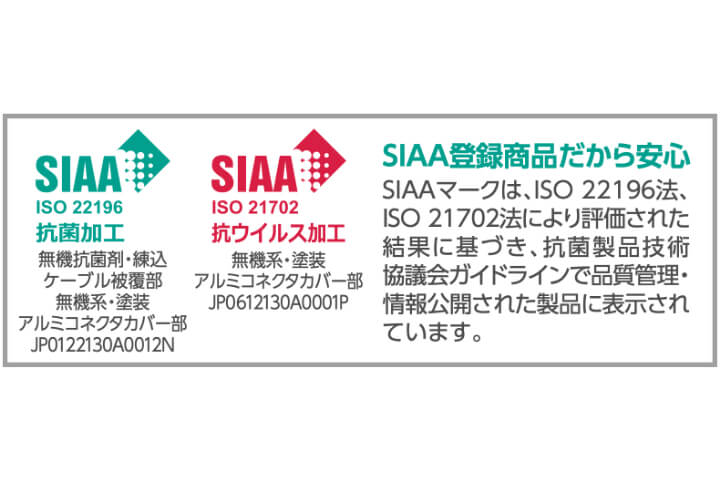 また、コネクターは抗ウイルス・抗菌加工(SIAA登録製品)、ケーブルは抗菌加工(SIAA登録製品)により雑菌の増殖を抑えるので、安心してご使用できます。