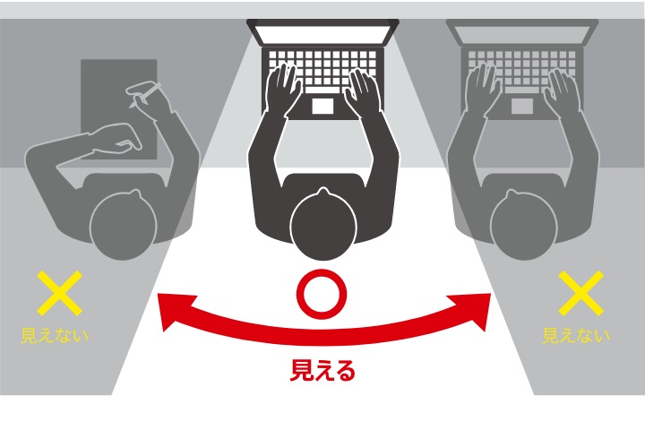 ■画面の正面を中心に60°(左右約30°)より外の角度からは画面が真っ黒に見えるので、パソコン画面を見られる心配がありません。