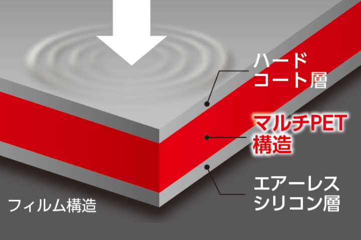 ■衝撃を吸収するマルチペット層に加え、指紋防止、エアーレスなどの機能を持つ高光沢タイプの衝撃吸収フィルムです。