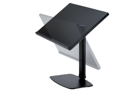 ディスプレイスタンドは10段階の高さ調整が可能となっており、肩や腰への負担を軽減します。水平方向に左30度~右30度、上下方向に上60度~下20度、画面回転360度と、細かい調整が可能です。