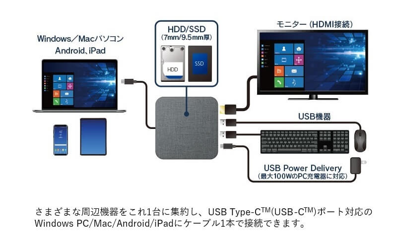 本製品には、4K映像の出力が可能なHDMI2.0ポートが1ポート、USB3.2(Gen1) USB-Aが2ポート、USB Type-C™(USB-C™)が1ポート搭載されています。さまざまな周辺機器を本製品に一括して接続の上、USB Type-C(USB-C)ポート対応のノートPC、スマートフォン、タブレットにケーブル1本で接続できます。