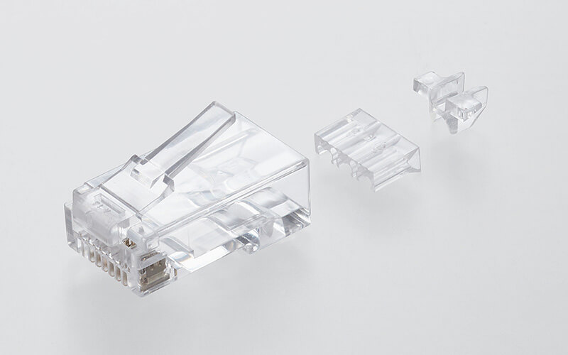 LANケーブルを自作する際に成端ミスを減らし、製作効率をアップできるガイドパーツ付きのRJ45コネクターです。コネクター本体のほか、ロードバー、ディバイダーを加えた3つのパーツで構成されています。