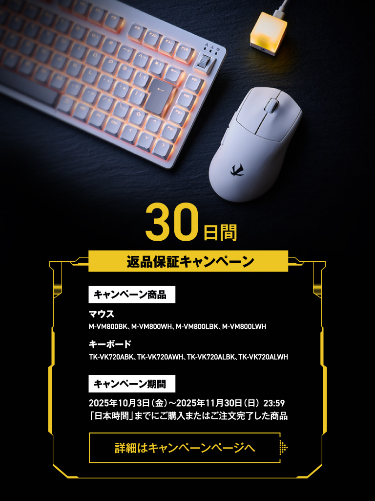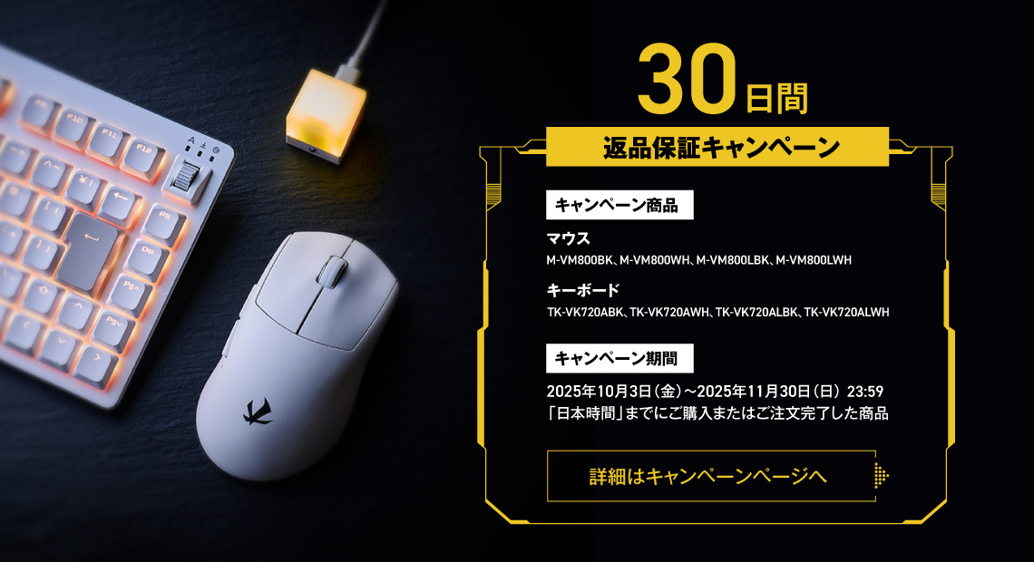 エレコム株式会社(本社:大阪市中央区、取締役社長執行役員:石見 浩一)は、ハイクラス・ゲーミングデバイス「ELECOM GAMING V custom」シリーズにおけるマウスとキーボードの返品保証キャンペーンを2025年10月3日(金)より実施します。万が一製品にご満足いただけなかった場合、購入日から30日以内であれば返品・返金が可能ですので気軽にお試しいただけます。