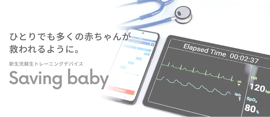 新生児蘇生トレーニングデバイス「Saving baby」は、スマートフォンやタブレットと専用アプリを用いて、低コストで実践的な新生児蘇生訓練を実現するトレーニングデバイスです。現場で赤ちゃんの命を救うには医療者の技術力と判断力が大切です。
