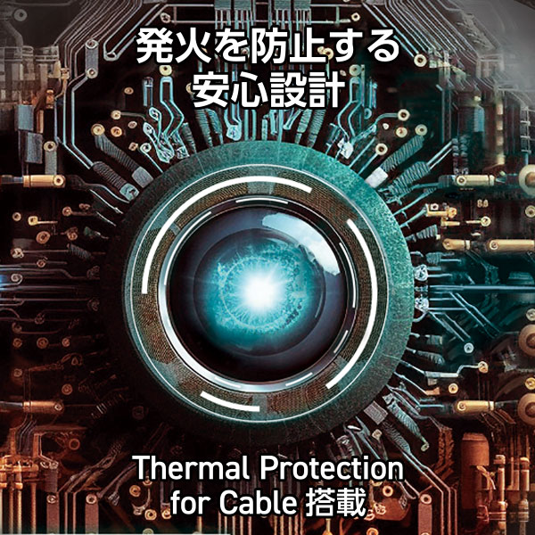 構造の特性から、安全の確保が最初の課題と捉えていました。エレコムの研究開発機能の中核である横浜技術開発センター・品質管理課だけではなく、パートナー企業などにも協力を仰ぎ、充電とデータ転送の接続タイミングがあえてズレるポゴピン構造を採用。さらにブレーカー(Thermal Protection for Cable)をコネクター内部に搭載することで、万が一ショートが起きても高温状態や過電流を検知して電流を遮断するため、意図しない事故を防ぎます。