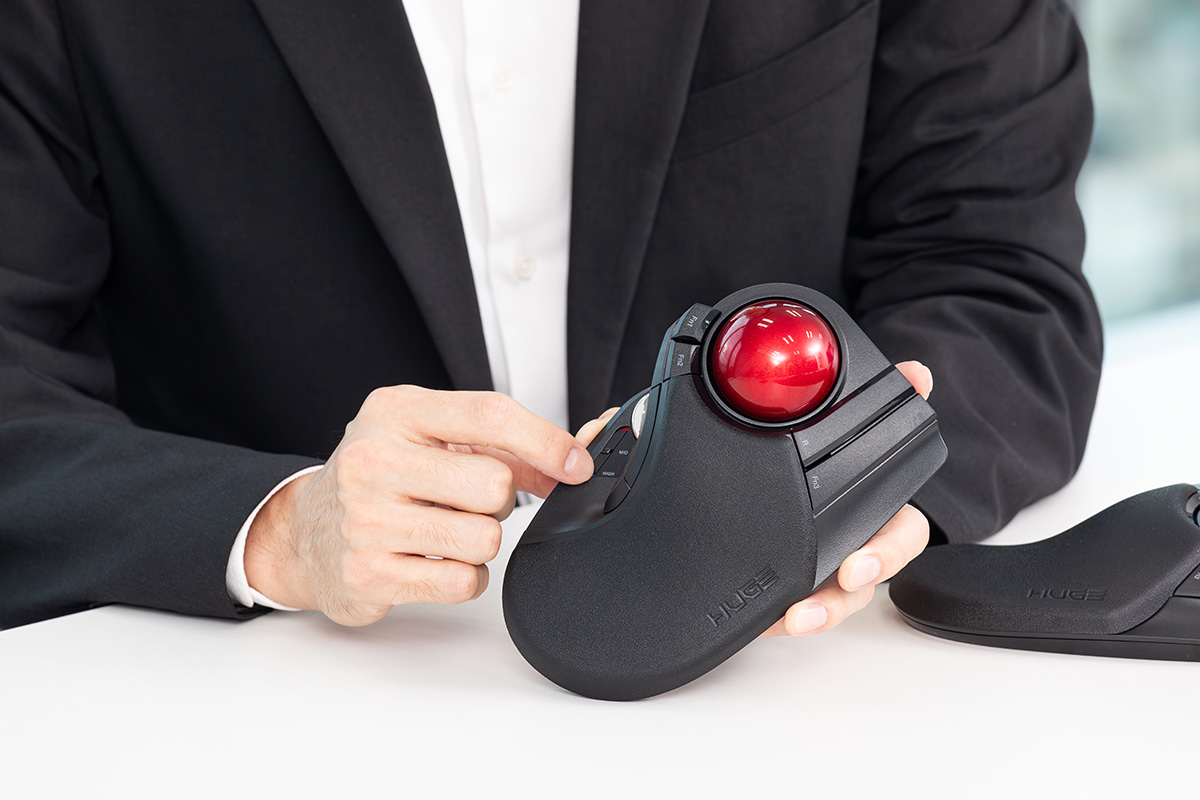 清水: 私たち開発チームは、EX-Gで人間工学的な"手に馴染む形"を追求した延長線上に、「腕を動かさずに、もっと快適に操作できる仕組み」というテーマが見えてきたんです。ユーザーの声を丁寧にお聞きしていくうちに「より疲れにくい操作方法はないか」という問いにたどり着き、その答えの一つがトラックボールでした。親指で操作する「EX-G トラックボール」などを経て、人さし指や中指でより大きなボールを操る「HUGE」へと繋がっていきました。