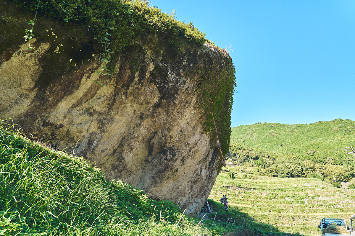 ▲棚田の中腹に鎮座する巨石には、しめ縄が巻かれている