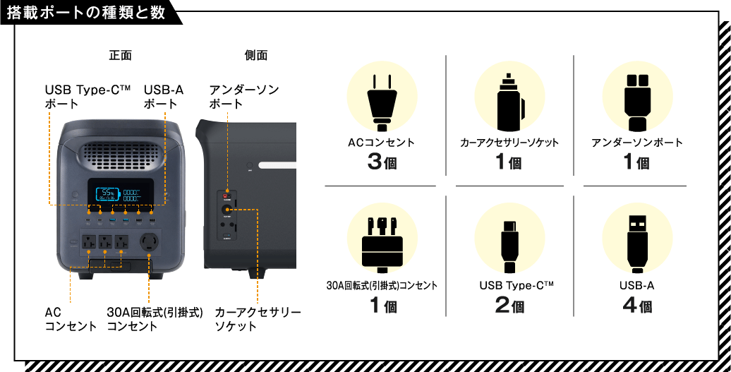 ACコンセント×3、30A回転式(引掛式)コンセント×1、カーアクセサリーソケット×1、アンダーソンポートx1、USB Type-CTMポート×2、USB-Aポート×4を搭載しています。複数台のスマホや電化製品も同時に使用できます。