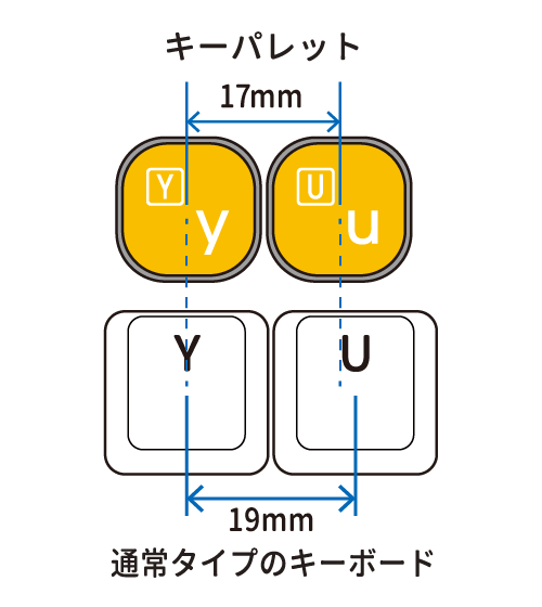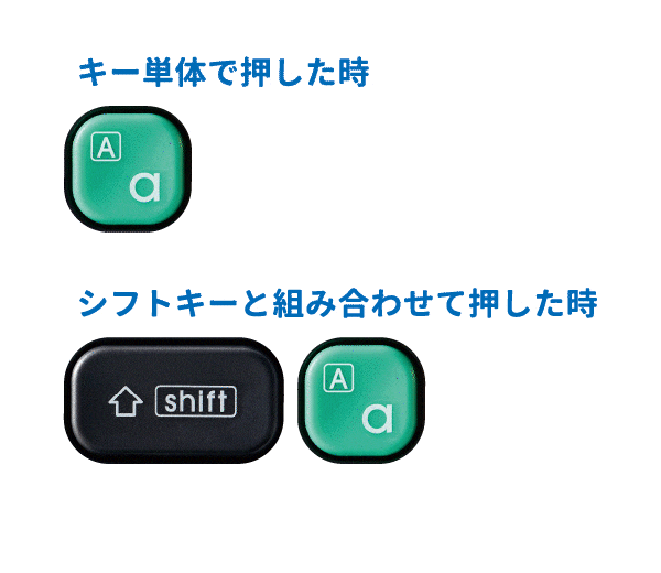 実際に入力される文字と同じ印字デザインで、キー単体で押した時の動作、シフトキーと組み合わせて押した時の動作を直感的に理解できます。