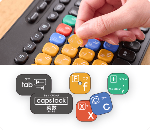 習熟度に合わせて必要なキーにだけ貼り付けることができる、よみがなシールを付属。アルファベットに不慣れな子どもたちの混乱を防ぎます。