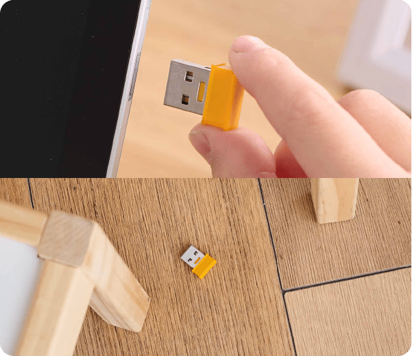 本体裏面にお名前スペースを設け、紛失や取り間違いを防止。また、USB無線モデルのレシーバーは床に落としてしまっても見つけやすいオレンジ色を採用しています。