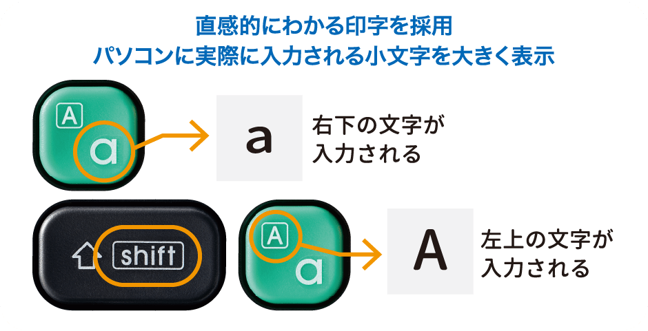 文字入力やプログラミングで主に使う“小文字”を大きく表記し、打ちたい文字が直感的にわかりやすい印字