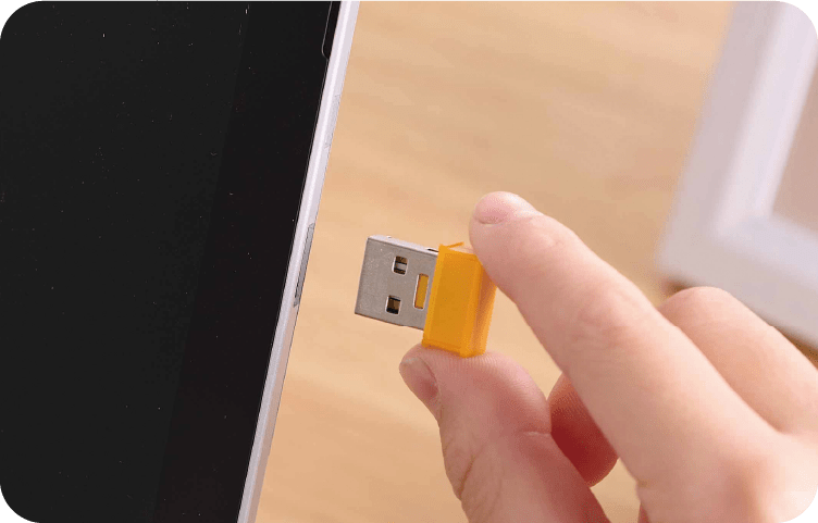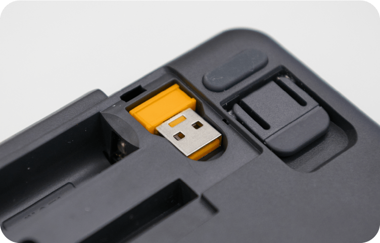 開発者:キーパレットの接続は、USB有線接続、USB無線接続、Bluetooth接続の3種類から選べます。USB無線接続にはパソコンのUSBポートに差すレシーバーを使用するのですが、これが小さくて子どもたちが失くしてしまう可能性があります。そのため、キーボードを使わないときや持ち運ぶ時にレシーバーを収納できる場所をキーパレット本体に設けています。また、落とした時に簡単に見つけられるよう、目立ちやすいカラーにしています。収納時には、入れる方向を間違えないようレシーバーの形状をかたどった穴にしていて、さらに指を引っ掛けて取り出しやすいようくぼみも設けています。
