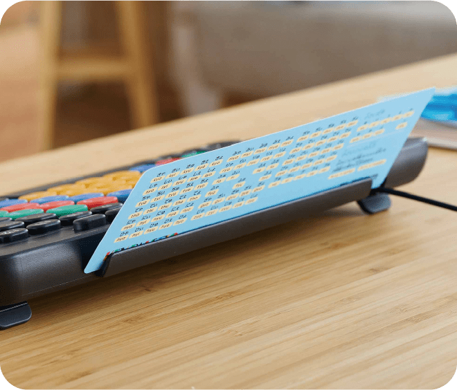 開発者:習熟度に合わせて貼り付けられる「よみがなシール」を同梱しました。低学年のうちは全てのキーに貼り付け、高学年になるにつれCtrlキーなど読み方が難しいキーのみに張り付けるといった使い方ができます。