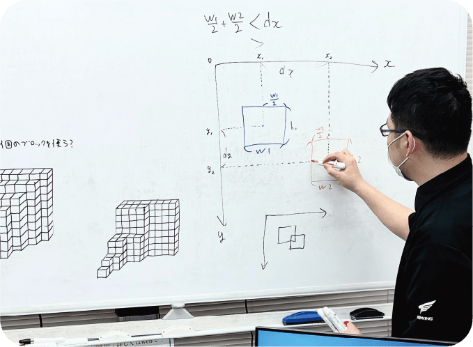 テックウイングでは、ロボット制作やプログラミングの際に必要になる、数学や物理の基礎知識についても教えている。