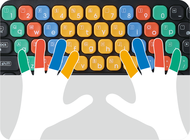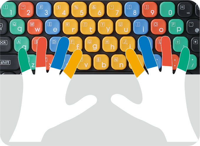 キーボードは、キータイピングの時に使う指ごとに色分けがされている。
