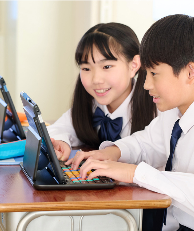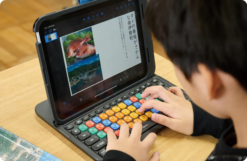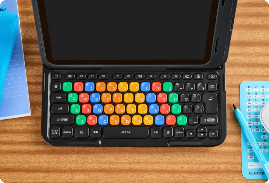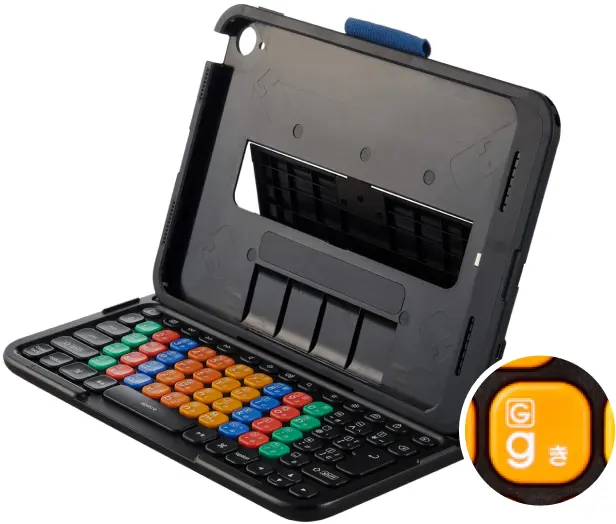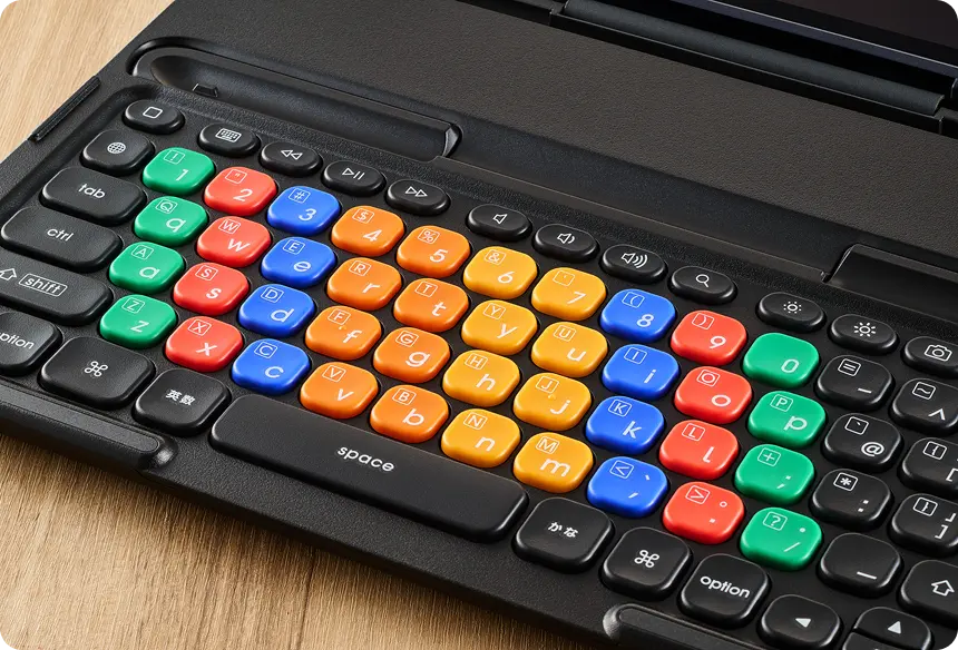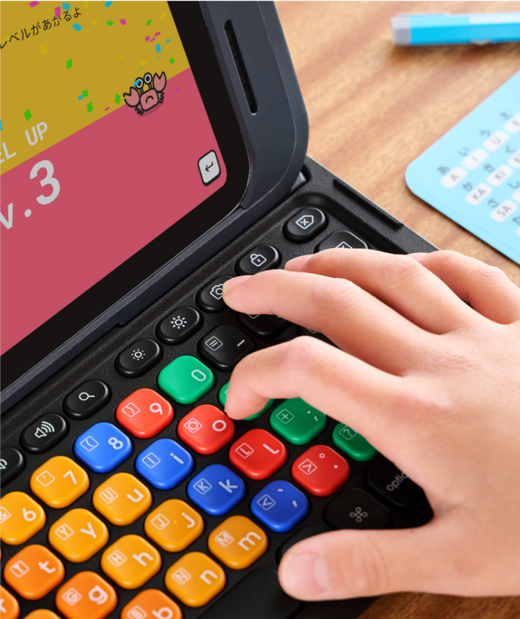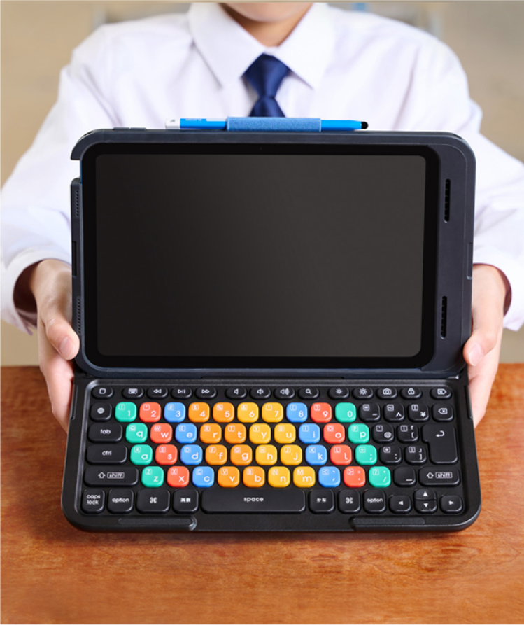 iPadで使用しやすい17mmピッチのコンパクト設計です。軽い力でもサクサクと打てる新設計のメンブレン方式を採用しています。使用頻度や機能などによってキー形状に変化をつけることで、これからタッチタイピングを学ぶ子どもたちが押し間違えしにくくなるよう工夫しました。