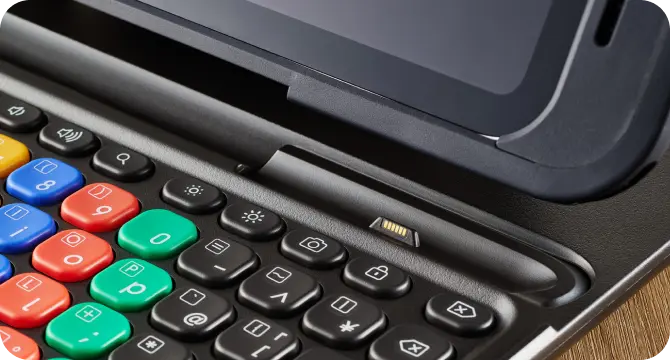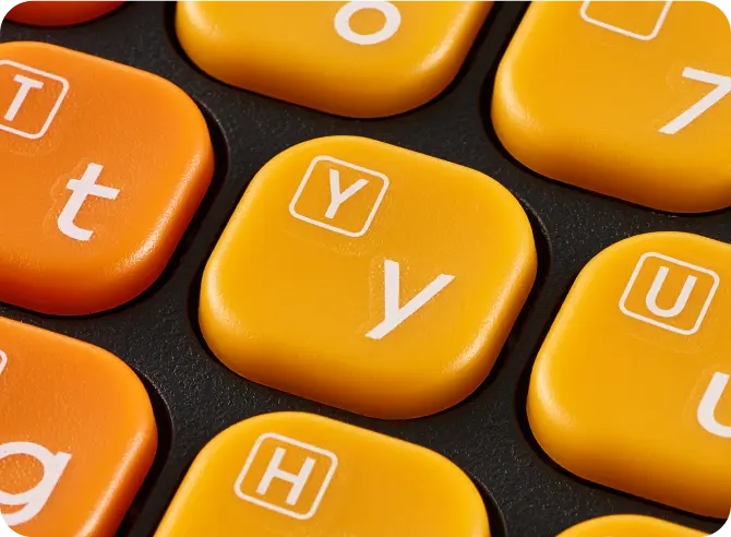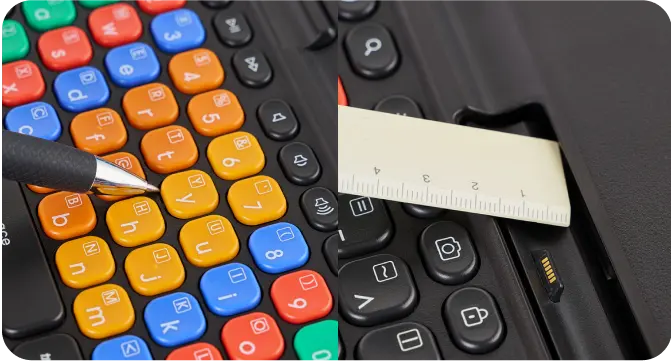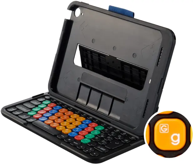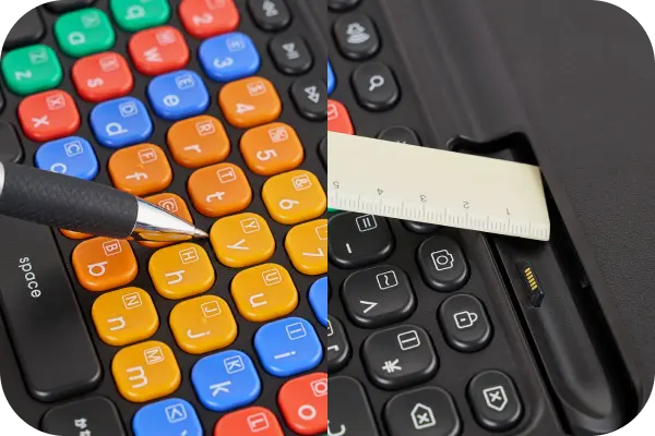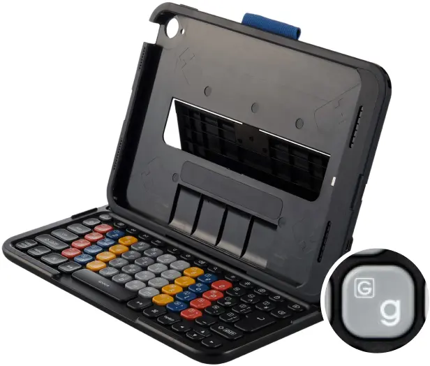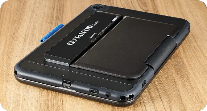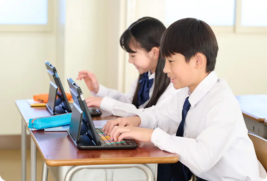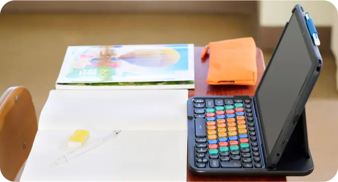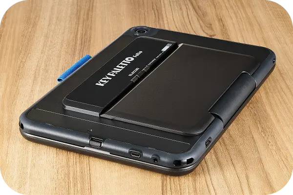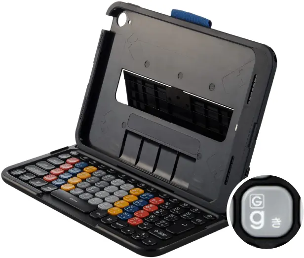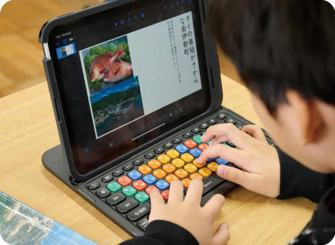 iPadで使用しやすい17mmピッチのコンパクト設計です。軽い力でもサクサクと打てる新設計のメンブレン方式を採用しています。使用頻度や機能などによってキー形状に変化をつけることで、これからタッチタイピングを学ぶ子どもたちが押し間違えしにくくなるよう工夫しました。