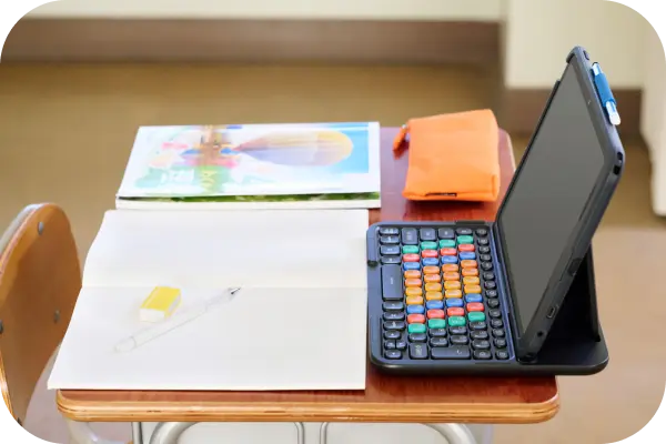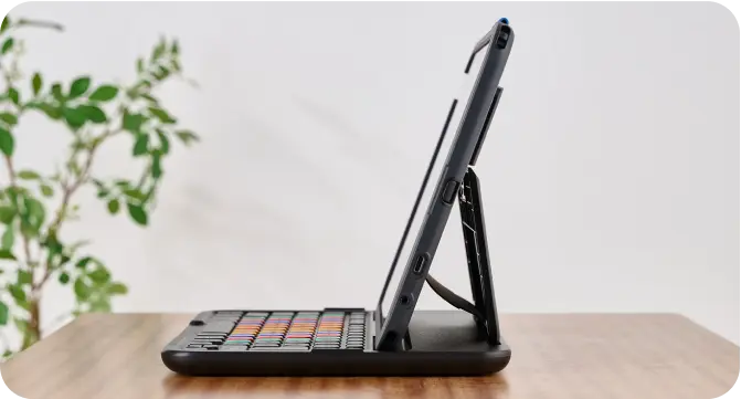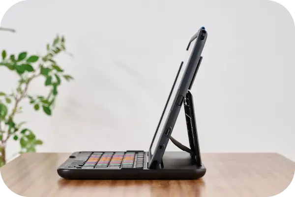 教科書や筆記用具と並べて置けるよう、省スペースで使えるコンパクト設計を実現。キーボードがiPad全体を受け止めるため安定感が高く、机の端に置いても落下しにくい設計です。