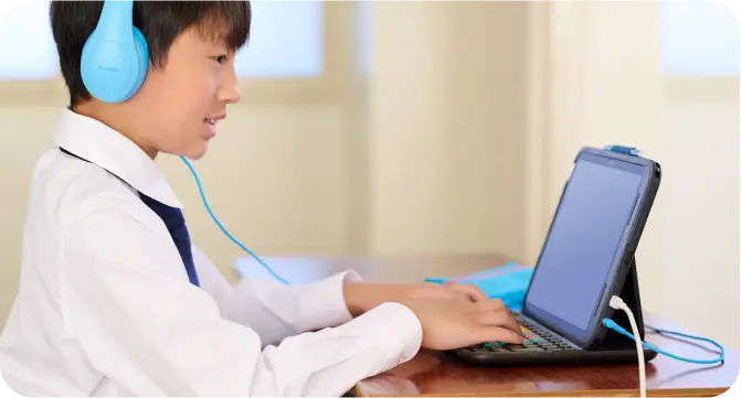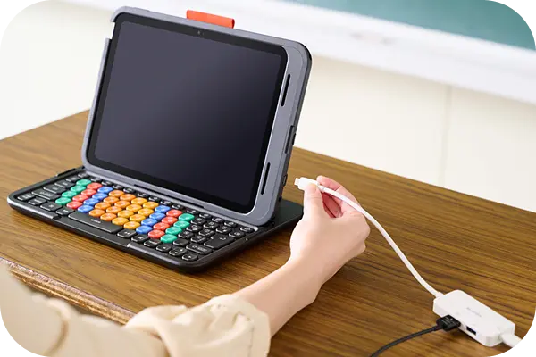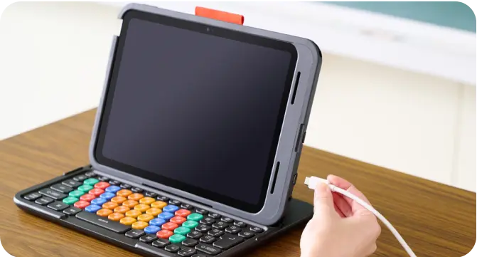 iPad本体とUSB Type-C™ポートで接続可能。キーボードはポゴピン経由で動作するため、安定した接続が可能です。煩雑な接続作業や教室内での混線といったトラブルが起こらないため、驚くほどスムーズに使い始められます。