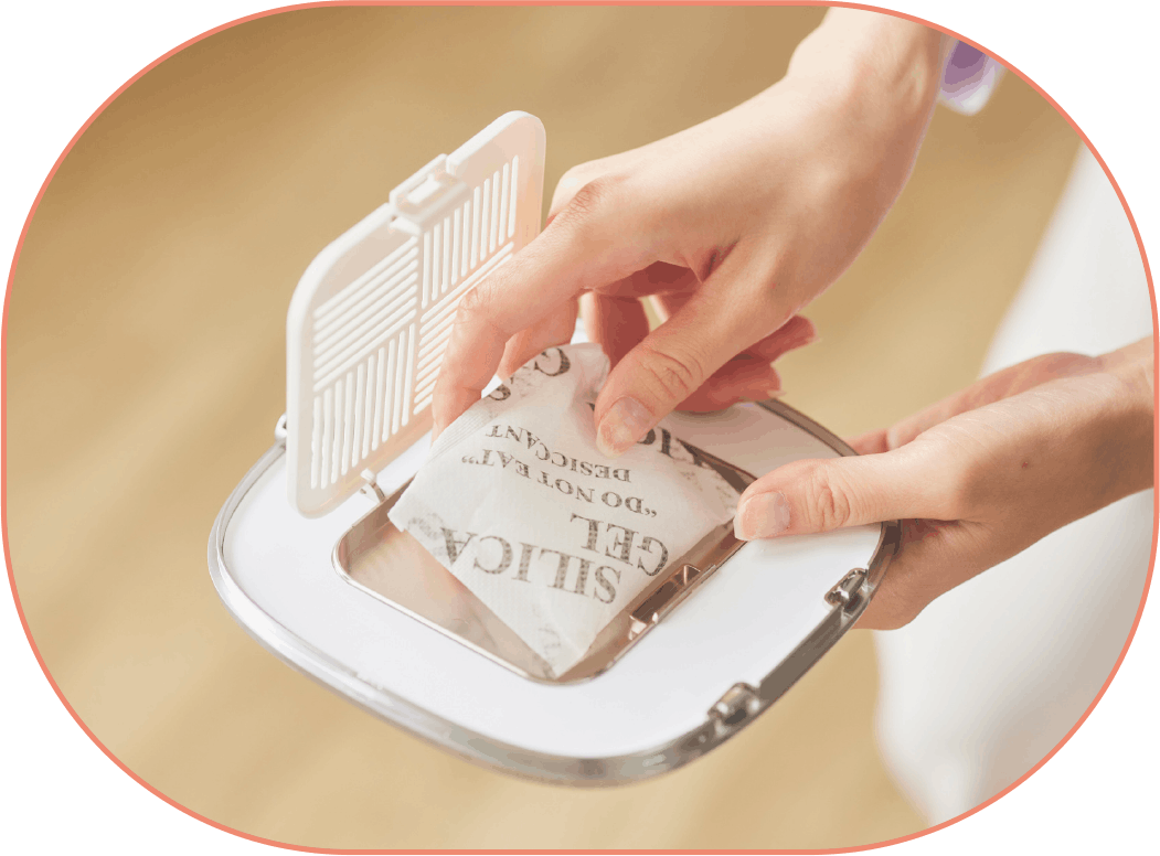 蓋裏側のポケットに乾燥剤をセットできます。