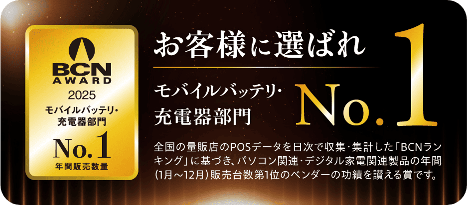 ※ BCNランキング2014年1月~2024年12月のモバイルバッテリ・充電器部門での販売数量実績