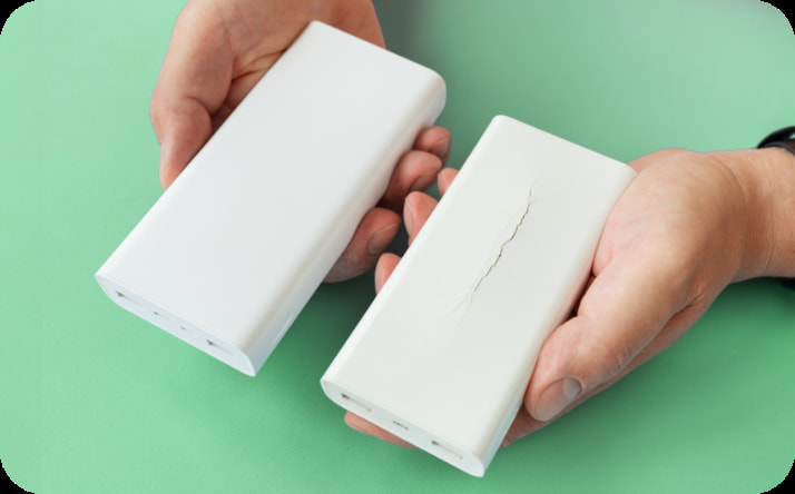 モバイルバッテリーに使用されているリチウムイオン電池には、熱や衝撃に弱いという特性があります。そもそもモバイルバッテリーは精密機械なので、強い衝撃を与えることはNGです。落としてしまったり、ズボンのお尻のポケットに入れたまま座ったりして強い力を加えると、機械的な破損からショート・発火の原因となる可能性があります。変形や破損が見られたときは、すぐに使用を中止し、新しいものに買い替えましょう。