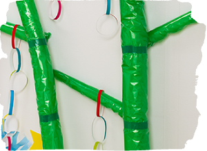 - 2)みどりのビニール袋を上から巻いてとめ、幹にはみどりのテープで巻いて竹の節をつくります。