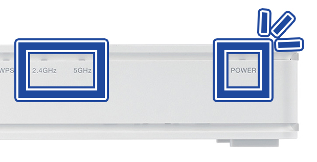 親機の準備が終わったら、中継器モードに使うWi-Fiルーターのランプを確認します。 親機との接続に成功していれば、WPSランプは「消灯」、2.4GHz/5GHzランプは接続している周波数帯の色で「点灯」、POWERランプが黄色で「点灯」しています。