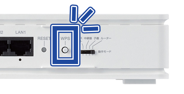 中継器モードに使うWi-Fiルーター背面にあるWPSボタンを、2~3秒間長押しします。 すると、WPSランプが赤色で「点滅」します。