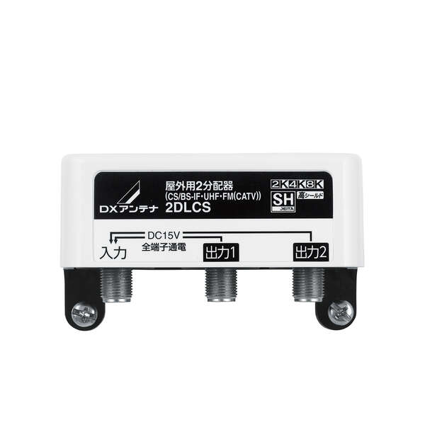 屋外で使用可能な防水構造の2分配器。既存の2K放送から全ての4K・8K放送まで対応した製品です。加工の手間が不要の防水キャップや蝶ナット1本でマストに取付できる簡単金具を採用した省施工設計です。樹脂ケース内部は高シールドダイキャスト構造で電波干渉を防ぎます。出力全端子・入力端子間通電式。