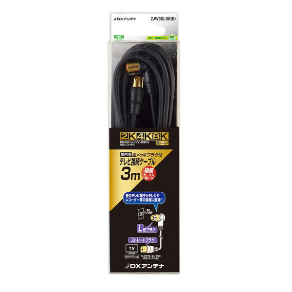 既存の2K放送から4K・8K(3224MHz)放送まで対応した製品です。壁のテレビ端子とテレビやレコーダーなどの接続に最適な、接続ケーブルです(3m)ワンタッチ式のL型プラグとストレートプラグを採用。細くて取り回しがしやすい2Cケーブルです。プラグ部分は金メッキで接触不良を防ぎます。ケーブル色 ブラックタイプ。