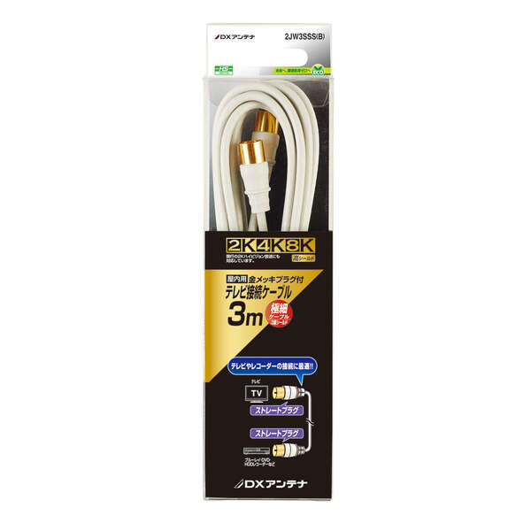 既存の2K放送から4K・8K(3224MHz)放送まで対応した製品です。壁のテレビ端子とテレビやレコーダーなどの接続に最適な、接続ケーブルです(3m)。両端ワンタッチ式ストレートプラグを採用。細くて取り回しがしやすい2Cケーブルです。プラグ部分は金メッキで接触不良を防ぎます。