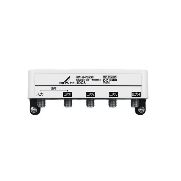 屋外で使用可能な防水構造の4分配器。既存の2K放送から全ての4K・8K放送まで対応した製品です。加工の手間が不要の防水キャップや蝶ナット1本でマストに取付できる簡単金具を採用した省施工設計です。樹脂ケース内部は高シールドダイキャスト構造で電波干渉を防ぎます。出力1端子・入力間通電式。