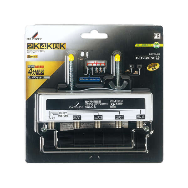 屋外で使用可能な防水構造の4分配器。既存の2K放送から全ての4K・8K放送まで対応した製品です。加工の手間が不要の防水キャップや蝶ナット1本でマストに取付できる簡単金具を採用した省施工設計です。樹脂ケース内部は高シールドダイキャスト構造で電波干渉を防ぎます。出力全端子・入力端子間通電式。ブリスターパック包装。