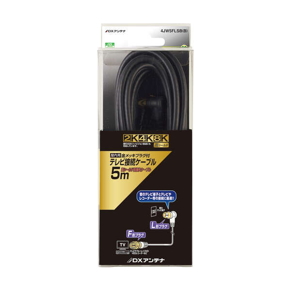 既存の2K放送から4K・8K(3224MHz)放送まで対応した製品です。壁のテレビ端子とテレビやレコーダーなどの接続に最適な、接続ケーブルです(5m)。ワンタッチ式のL型プラグとネジ式のF型プラグを採用。低損失な4Cケーブルです。プラグ部分は金メッキで接触不良を防ぎます。ケーブル色 ブラックタイプ。