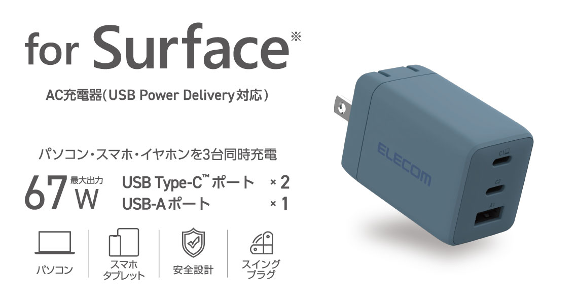 ノートパソコン・スマホ・ワイヤレスイヤホンを3台同時充電OK!コンパクトながらUSB-AとUSB Type-C(TM)、いずれのケーブルも接続できるAC充電器です。USB Power Delivery 67Wの高出力で幅広い機器をしっかり充電できます。Microsoft Surface Pro 12と合わせて使えるカラーリングの製品です。