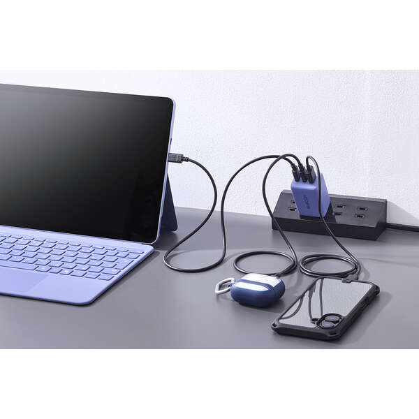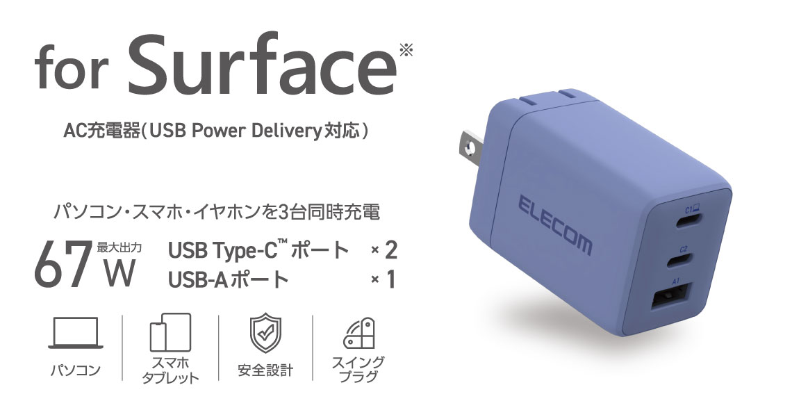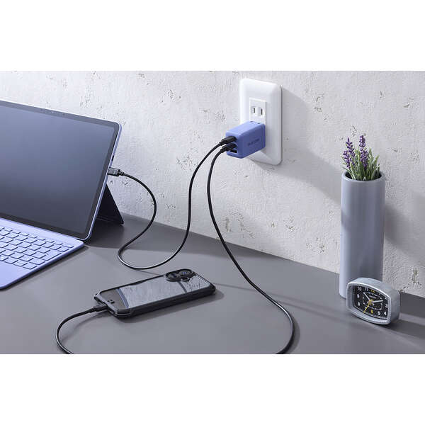 ノートパソコン・スマホ・ワイヤレスイヤホンを3台同時充電OK!コンパクトながらUSB-AとUSB Type-C(TM)、いずれのケーブルも接続できるAC充電器です。USB Power Delivery 67Wの高出力で幅広い機器をしっかり充電できます。Microsoft Surface Pro 12と合わせて使えるカラーリングの製品です。