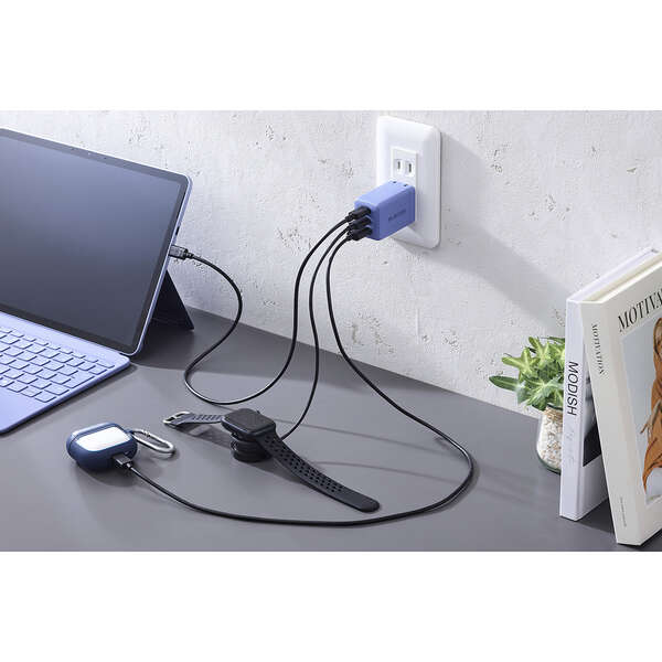 3つの出力ポートを搭載。用途に合わせて接続先を使い分けられるから、ノートパソコンやスマートフォン、タブレット、ワイヤレスイヤホンなどを組み合わせて同時に充電できるAC充電器です。